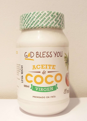 Este aceite de coco God Bless You es un aceite neutro, sin aroma y sin sabor extraido a 24° de temperatura.