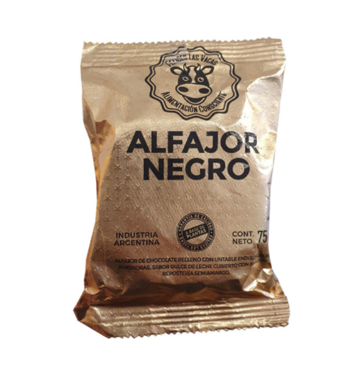 Untable endulzado de almendras sabor dulce de leche*, galletitas dulces sabor chocolate y baño de repostería semiamargo alfajorera.