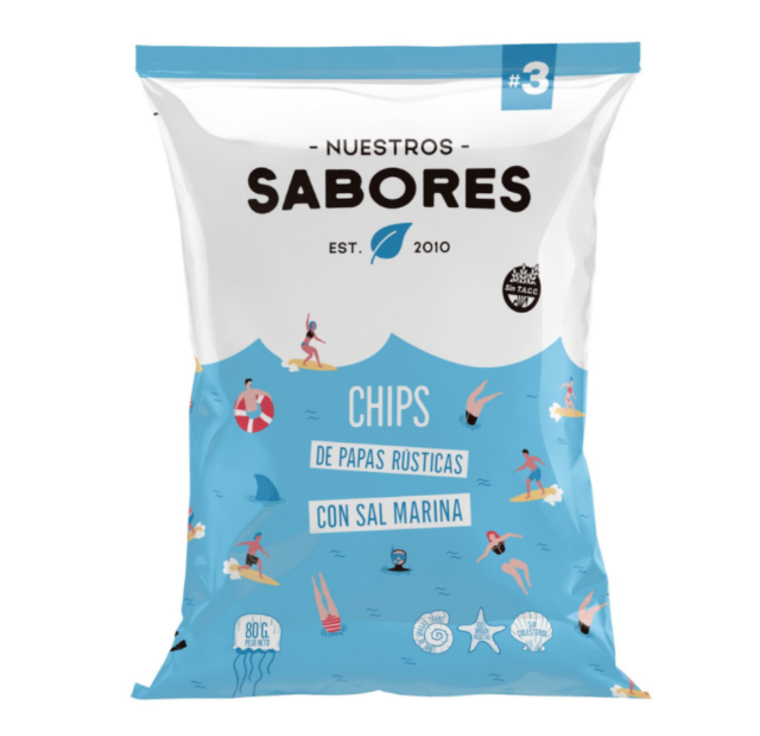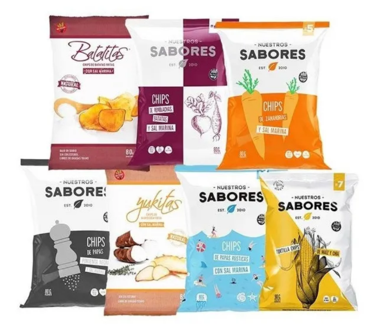 | Sabor | Chips de Papa, pimienta negra y sal marina, Chips de Papa con sal marina, Chips de Batata con sal marina, Chips de Remolacha con sal marina, Tortilla Chips de Maíz y Chia con sal marina |
