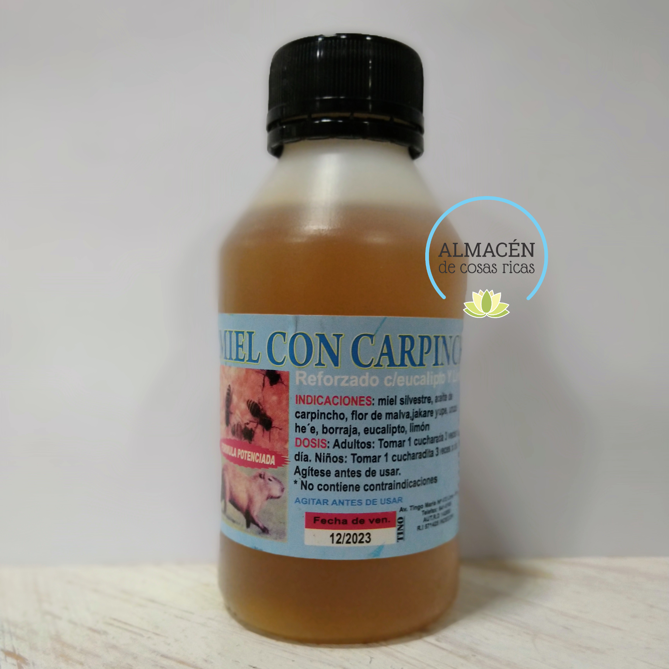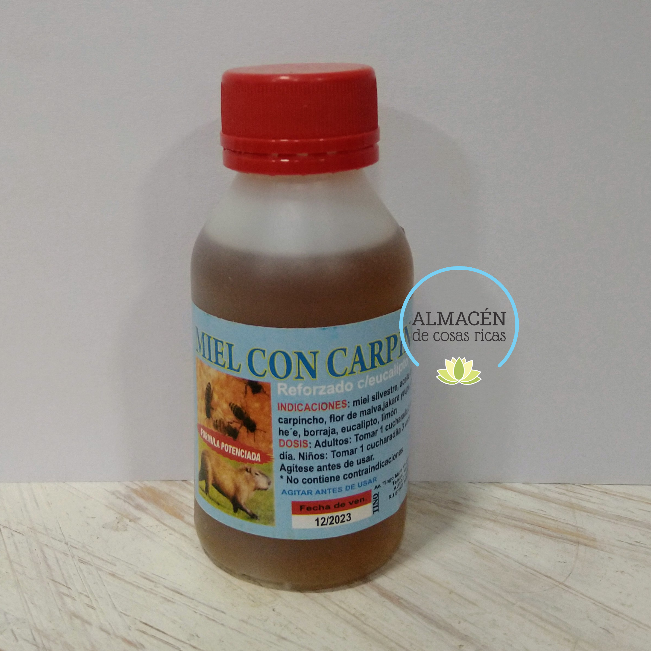Miel con carpincho 100% natural reforzado con eucalipto y limón. Para la tos, bronquios, asma, falta de aire y mucho mas. Presentación: 110 cc