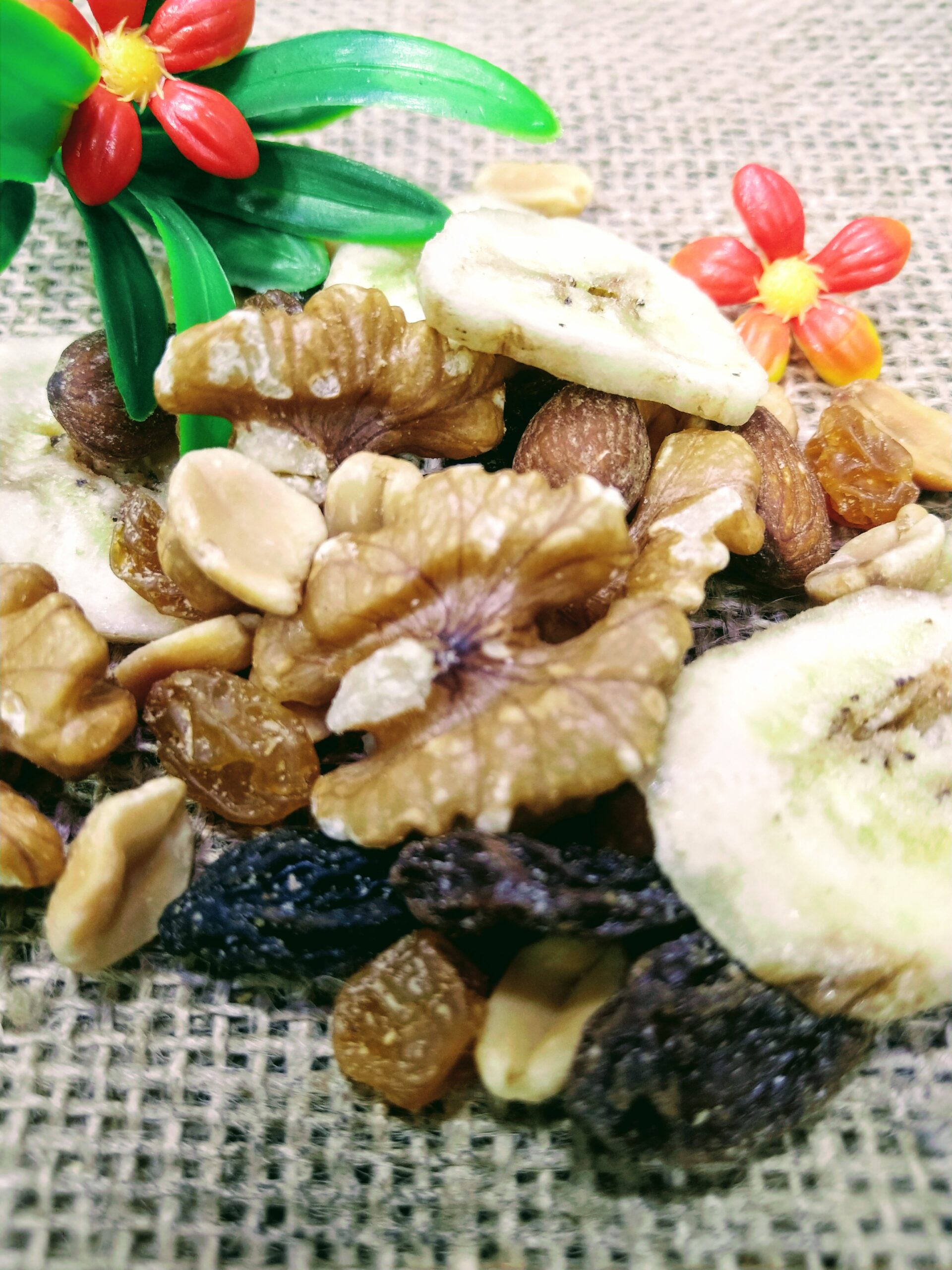 Ingrediente: Pasas flame, pasas rubias, almendras, maní sin sal, bananitas chips, nueces light
